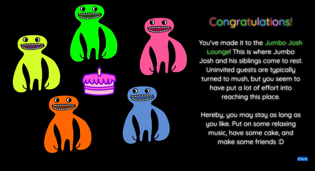 You've made it to the Jumbo Josh Lounge! This is where Jumbo Josh and his siblings come to rest. Uninvited guests are typically turned to mush, but you seem to have put a lot of effort into reaching this place.