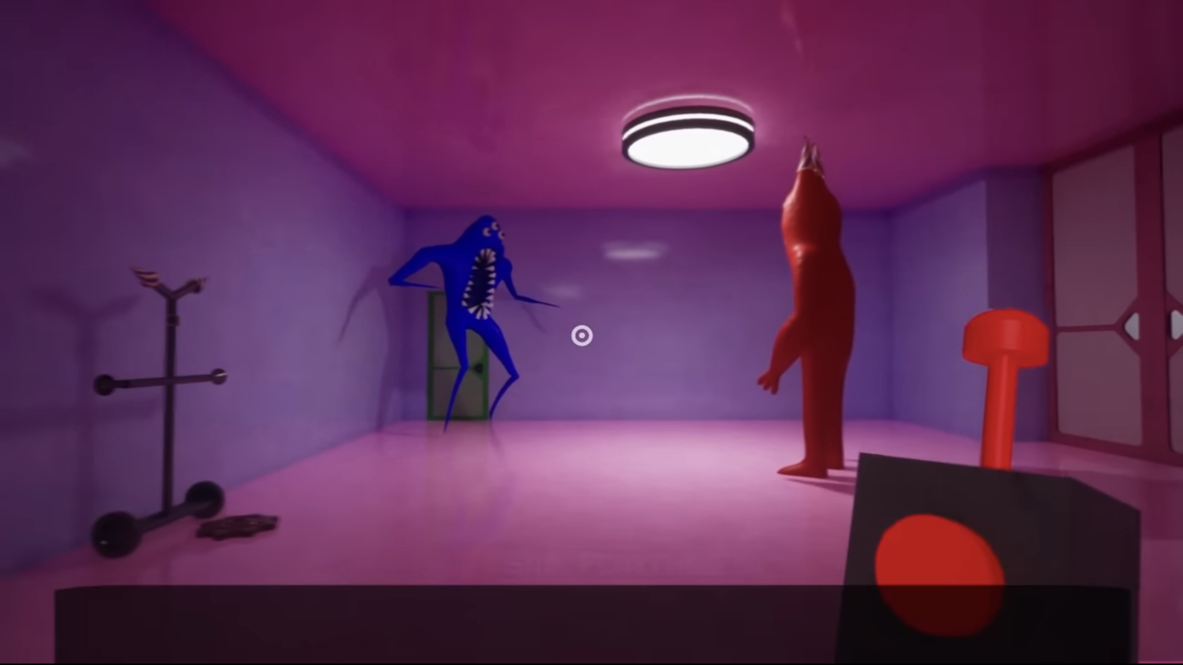 Banban quickly chases after him with the Player following behind. The chase unfolds through a long, twisting corridor, and finally a parkour course room with a left. In the corner of the parkour course is a small resting platform that has a videotape on the table.[1] Unfortunately, the player is slower than Nabnab and Banban, so by the time the Player has caught up, Banban is already cornering Nabnab behind a glass wall. The player watches as Nabnab lunges at Banban and they begin to fight, with flickering lights acting as scene transtitions, but eventually Banban loses control of himself and transforms into his Hellish form. Hellish Banban throws Nabnab in a wall, knocking him unconscious, and the fight ends with Nabnab laying on the ground and Banban leaning on a wall with a givanium smear next to him.